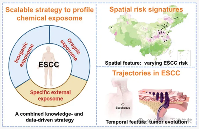 我们的身体每天都在接触各种化学物质:空气里的污染物、食物中的添加剂、水中的微量元素,还有身体自身代谢产生的内源性化合物。这些所有暴露的化学物质总和,就是”化学暴露组”。食管癌的发生离不开基因和环境的共同作用,但以往研究发现:即使是发病率相差巨大的地区,患者的基因突变特征也很相似。这意味着,非遗传的化学暴露因素,可能才是解释食管癌地域性高发的核心密码。不同于以往只关注单一化学物质的研究,这次科学家采用了”知识驱动+数据驱动” 的双重策略,整合了无机元素(如金属)、内源性化合物(如代谢产物)和外源性化合物(如污染物、食品成分),全面捕捉与食管癌相关的化学信号。