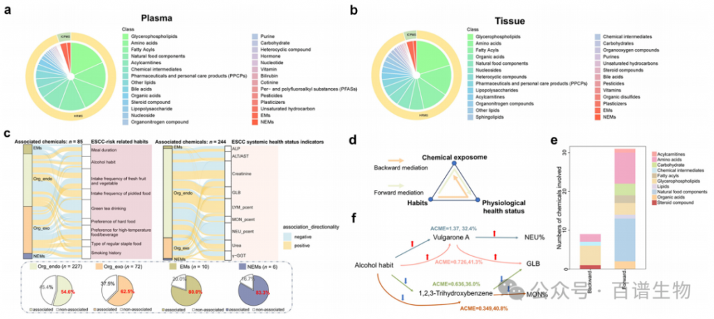 研究明确了调查范围:以食管癌发病率56/10万和21/10万为界,划分高风险区和低风险区,所有参与者都在对应区域居住了20年以上。通过分析,科学家在血浆中识别出315种化学特征,在食管组织中识别出440种,这些化学物质都可归为四类——必需金属、非必需金属、内源性有机化合物(身体自身代谢产生)和外源性有机化合物(来自环境、食物等外部来源)。值得注意的是,血浆和组织中存在128种共同的化学特征,这说明两者可能共享部分环境暴露路径和生物信号传导机制。而且这些化学物质并非孤立存在,而是形成了复杂的相互作用网络,既有正向关联也有反向关联,共同影响着身体状态。