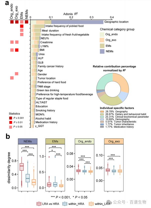 研究最关键的发现之一,是明确了地理居住地对体内化学暴露特征的影响最大。量化分析显示,地理因素对化学暴露组的贡献占比约28.8%,是第二大影响因素(腌制食品摄入频率)的4倍以上。更特别的是,地理因素是唯一对四类化学物质都有显著影响的因素,其他因素仅能影响部分类别。而且高风险区患者体内的化学暴露特征差异,显著大于低风险区患者。这意味着高风险区的化学环境更复杂,即便在地理范围较窄的区域内,化学物质组成也会出现剧烈波动,暗示当地的空气、水、土壤等环境中,可能存在特定的有害化学物组合。