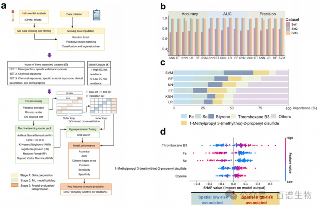 为了找到驱动食管癌地域差异的关键化学物,科学家运用了6种机器学习模型,对收集的数据进行深度挖掘。结果显示,仅依靠化学暴露相关数据,模型区分高、低风险区的准确率、AUC等指标就都超过0.9,性能优于单纯依靠人口统计学和生活习惯的数据,甚至能媲美整合所有数据的模型,足以证明化学暴露特征对地域风险的指示作用极强。通过进一步分析,研究锁定了5种核心化学标志物,它们的累积重要性占比超过50%:铁和硒的低水平,与高风险区显著相关;而苯乙烯(常见工业污染物)、1-甲基丙基3-(甲硫基)-2-丙烯基二硫化物(植物来源)、血栓素B3(生物活性信号分子)的高水平,则会增加关联高风险区的概率。