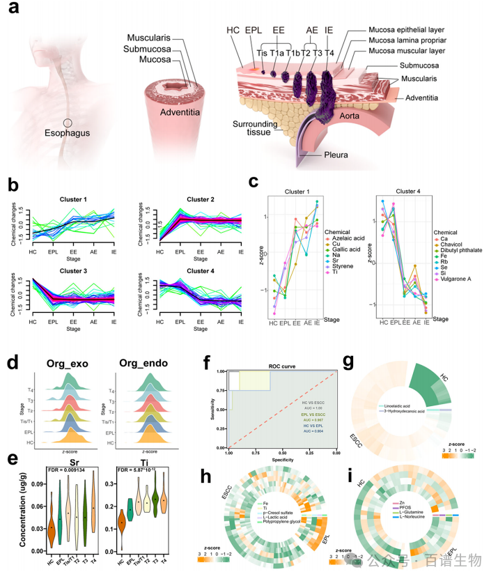 从健康状态到癌症发生,体内的化学暴露特征会经历一系列可追踪的变化,这为早期筛查提供了重要线索。研究发现,近半数化学物在健康人到癌前病变(食管炎)阶段,就会发生剧烈波动,说明化学暴露特征的改变可能早于疾病的明显进展。具体来看,部分化学物(如壬二酸、铜、苯乙烯)会随疾病进展持续上升,而另一些(如钙、铁、邻苯二甲酸二丁酯)则呈逐步下降趋势。此外,外源性有机化合物在健康人和癌前病变阶段的差异尤为显著,钛和锶这两种来自外部环境的元素,会随肿瘤发生显著升高。基于这些差异化学物构建的检测面板,在区分健康人与癌前病变、健康人与食管癌、癌前病变与食管癌时,都表现出优异的诊断性能,为开发非侵入性筛查工具提供了明确靶点。