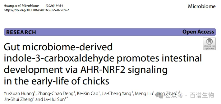 文章题目:Gut microbiome-derived indole-3-carboxaldehyde promotes intestinal development via AHR-NRF2 signaling in the early-life of chicks