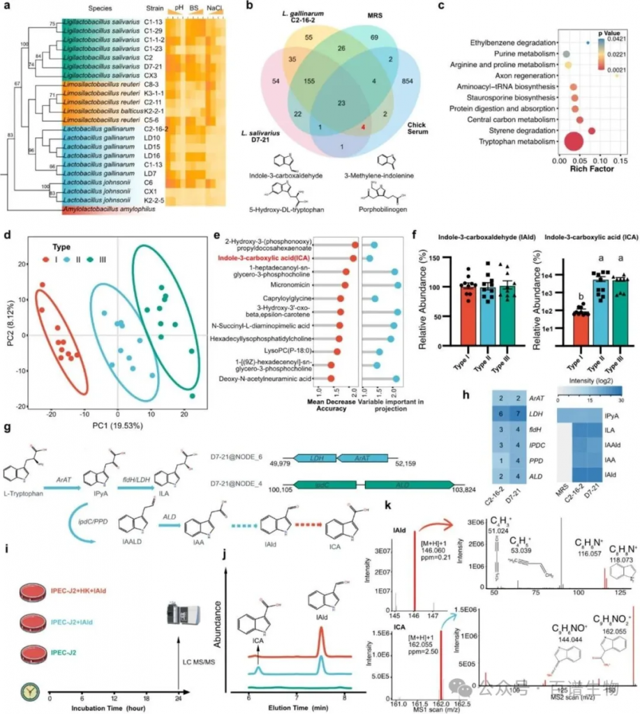 非靶向代谢组分析鉴定出菌株发酵液与鸡血清共有代谢物4种,其中3种参与色氨酸代谢,通路富集分析显示差异代谢物主要集中于色氨酸代谢通路。PLS-DA分析表明,3种菌群分型的血清代谢组存在显著分离,随机森林与OPLS-DA VIP评分联合筛选出吲哚-3-羧酸(ICA)为核心差异代谢物。定量分析显示,Type II/III血清中ICA丰度显著高于Type I,而吲哚-3-甲醛(IAld)丰度无显著组间差异。菌株基因组测序证实,L.gallinarum C2-16–2与L.salivarius D7-21携带完整的色氨酸代谢基因簇(ArAT、LDH、IPDC、ALD),可体外合成IAld;IPEC-J2细胞试验与酶学验证表明,IAld可通过黄嘌呤脱氢酶催化转化为ICA,且ICA体外生物活性高于IAld。