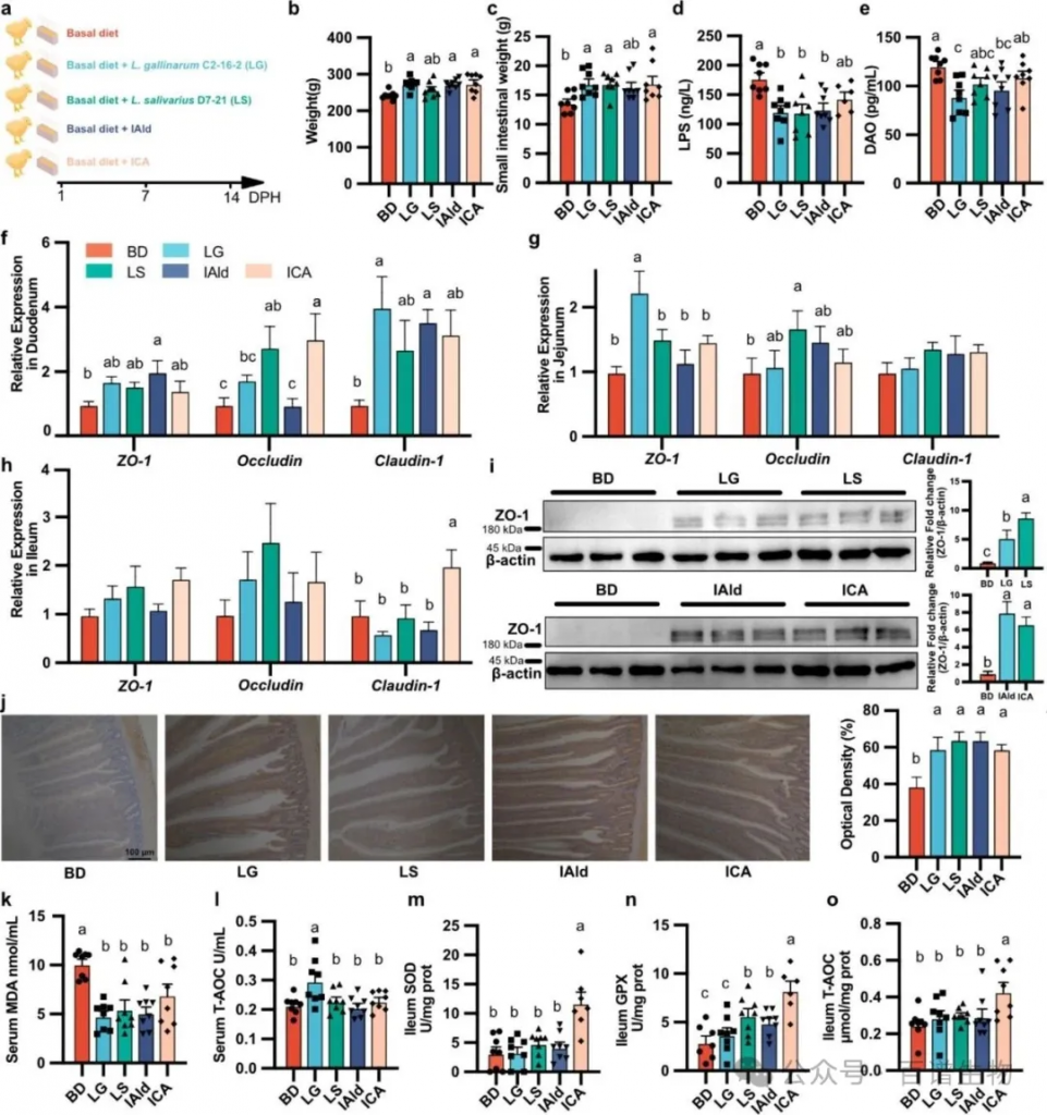 动物饲喂试验显示,LG、LS、IAld、ICA处理组14日龄雏鸡体重及小肠重量显著高于基础日粮组,血清LPS、DAO水平显著降低。RT-qPCR结果显示,LS组显著上调十二指肠和空肠Occludin表达,LG组显著上调空肠ZO-1表达,ICA组显著上调十二指肠Occludin及回肠Claudin-1表达;WB及免疫组化证实,各处理组十二指肠、空肠ZO-1蛋白表达均显著升高。抗氧化指标检测显示,各处理组血清MDA浓度显著降低,LG组血清T-AOC显著升高,LS和ICA组回肠GPX活性显著提升。