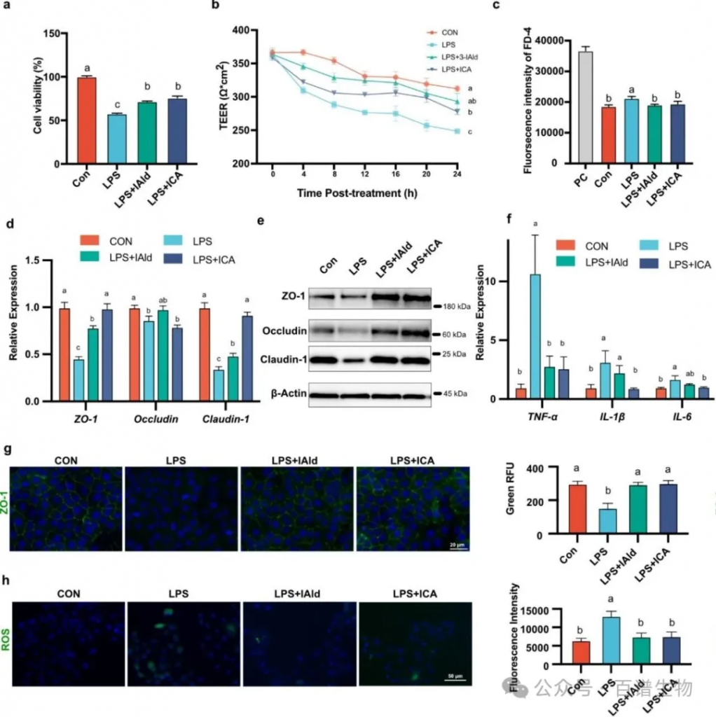 LPS诱导IPEC-J2细胞损伤后,50μM IAld和5μM ICA预处理可显著提升细胞活力、TEER值,降低FD-4通透性。分子水平上,IAld/ICA处理显著上调ZO-1、Claudin-1 mRNA及蛋白表达,并显著降低TNF-α、IL-1β、IL-6炎症因子mRNA水平。免疫荧光显示,IAld/ICA可改善LPS诱导的ZO-1蛋白分布紊乱,同时显著降低细胞内ROS水平,证实其对肠道上皮屏障的保护及抗炎抗氧化活性。
