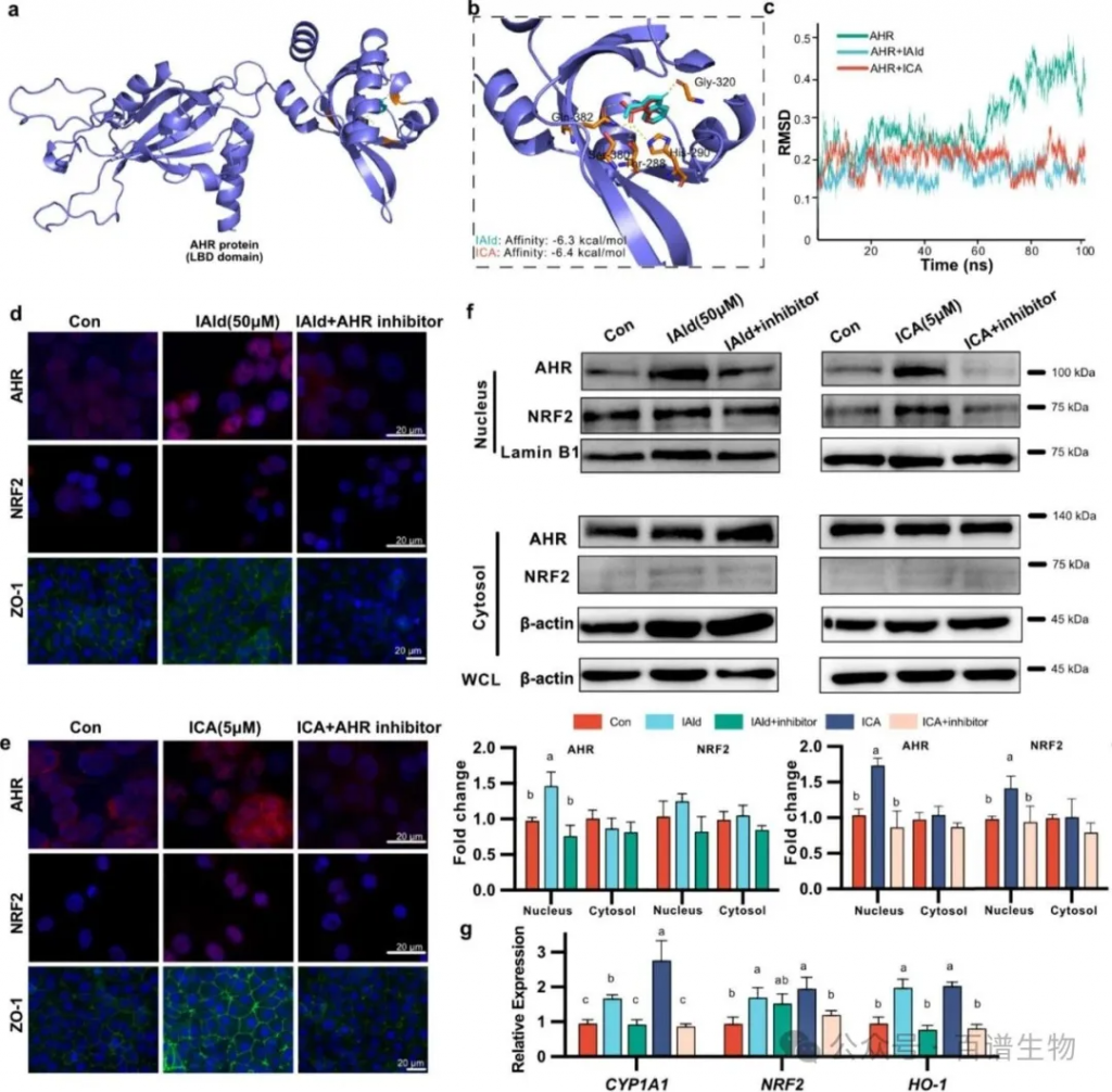 分子对接与MD模拟证实,IAld可与AHR蛋白形成3个氢键,ICA可形成4个氢键,且ICA-AHR复合物RMSD值<0.2nm,结合更稳定。细胞试验显示,IAld/ICA 处理可促进AHR从细胞质向细胞核转位,显著上调下游CYP1A1、NRF2、HO-1基因表达;WB证实NRF2核蛋白表达水平在ICA处理组显著升高。AHR抑制剂可逆转上述调控效应,证实IAld/ICA通过激活AHR–NRF2通路,上调紧密连接蛋白表达并增强抗氧化能力,为其肠道保护作用的核心机制。