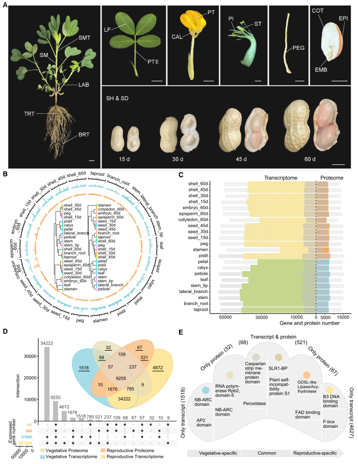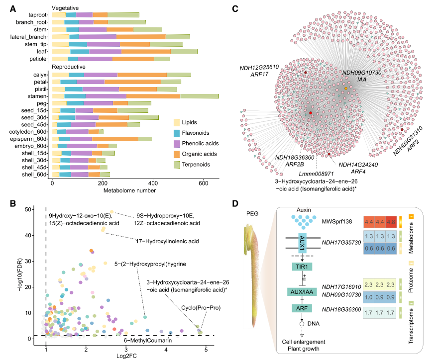 研究成功绘制花生22个组织的多组学图谱,转录组检测到53,030个表达基因,蛋白质组鉴定出12,826个独特基因,代谢组发现2,035种代谢物,同时新增2147个基因编码的2185种新型蛋白质及274个微蛋白,极大丰富了花生蛋白质数据库。明确WDR13、TANGO、RPP13等关键基因在发育与抗逆中的核心作用;第8号染色体上的DEF3和DEF1基因分别编码花生过敏原13和12,DEF3受青枯菌诱导后可增强抗病性。针对花生特有果针发育过程,揭示IAA-ARF家族的激素信号传导调控作用,构建核心网络。将基因分为四类,营养与生殖转录组共享34222个基因,四类共共享9255个,转录组特异性基因数量远多于蛋白质组,且不同类型特异性基因功能富集于异黄酮合成、昼夜节律调控等不同通路。