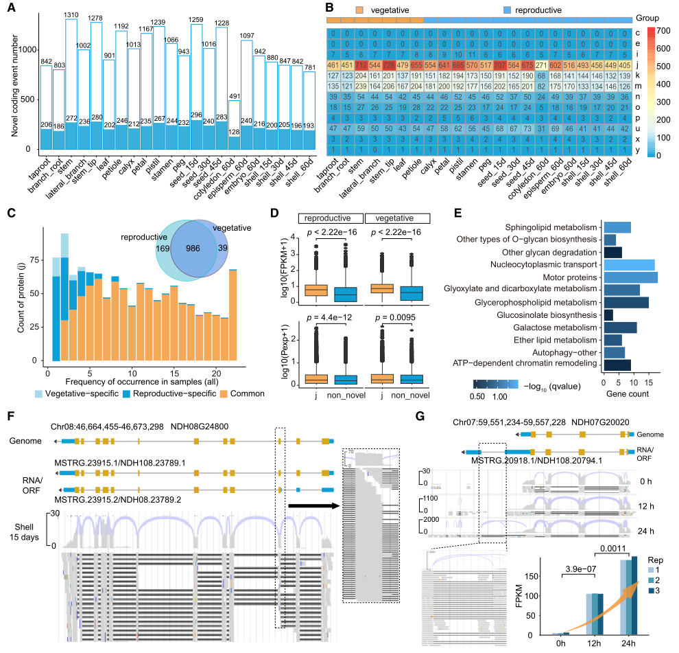 研究者结合转录组与蛋白质组学证据,显著扩展了花生NDH108品种的蛋白质资源库,通过质谱鉴定出2147个基因编码的2185种新型蛋白质,这些新型编码事件在各组织中分布为491-1310个/组织,以j、k、m类为主要类型。j类基因在转录组和蛋白质组水平表达量均显著高于其他类型,且在所有组织中表达稳定,功能富集于鞘脂代谢、O-葡聚糖生物合成等通路;k类基因参与蛋白质输出、染色质重塑等过程,其中TANGO基因存在3’UTR延伸,青枯菌感染24小时后表达显著升高,可能参与抗病反应;m类基因与硫胺素代谢、核糖体生物发生相关。此外,还鉴定出121个基因间区(u 类)蛋白,其中抗病相关的RPP13样蛋白仅在雄蕊和花瓣中表达,且经3种不同肽段序列验证,补充了可变剪接等编码事件,完善了花生基因组注释。