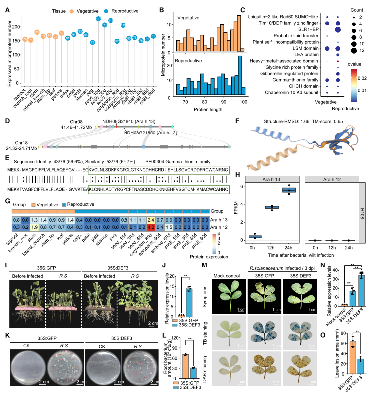 通过蛋白质组学方法,在22种花生组织中鉴定出274个微蛋白基因,包括269个参考基因和5个新基因,长度介于66-100个氨基酸,在营养组织和生殖组织中均有表达且功能存在明显差异。生殖组织特异性微蛋白富集SLR1-BP、LEA蛋白等功能结构域,而营养组织特异性微蛋白无此类特征。关键发现为第8号染色体上相邻的DEF3和DEF1基因,二者分别编码花生过敏原13和12,在子叶中高表达;DEF3为该染色体特有,青枯菌感染后表达显著上调,过表达实验证实其可增强花生对青枯菌的抗性,DEF1则无此响应。此外,SLR1-BP、SLE2等微蛋白具有组织特异性表达模式,深度参与花生发育及抗逆过程。