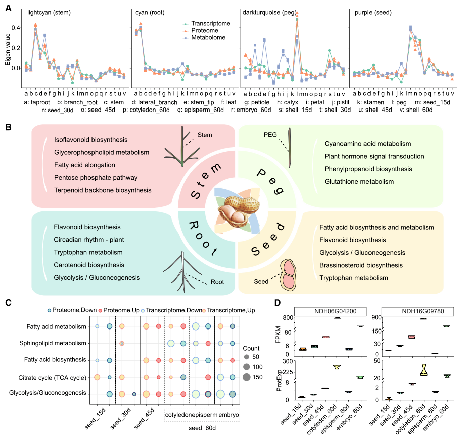 借助加权基因共表达网络分析(WGCNA),研究将基因聚类为24个具有明显组织特异性的共表达模块,如茎相关模块ME_lightcyan、根相关模块ME_cyan、果针相关模块ME_darkturquoise、种子相关模块ME_purple等。功能富集分析显示,不同模块关联特定代谢通路:茎模块富集异黄酮生物合成、脂肪酸延长等通路,根模块与黄酮类生物合成相关,果针模块涉及植物激素信号传导,种子模块聚焦脂肪酸代谢、糖酵解等通路。对种子发育15-60天的差异基因分析发现,45天时期脂肪酸代谢、TCA循环等关键通路基因显著上调;同时鉴定出同源基因ADRC1与NDH16G09780存在表达失衡,ADRC1在60天子叶和胚中转录组与蛋白质组水平均高表达,NDH16G09780仅转录组水平高表达,差异可能源于UTR区域分化,清晰展现花生组织发育的分子动态特征。