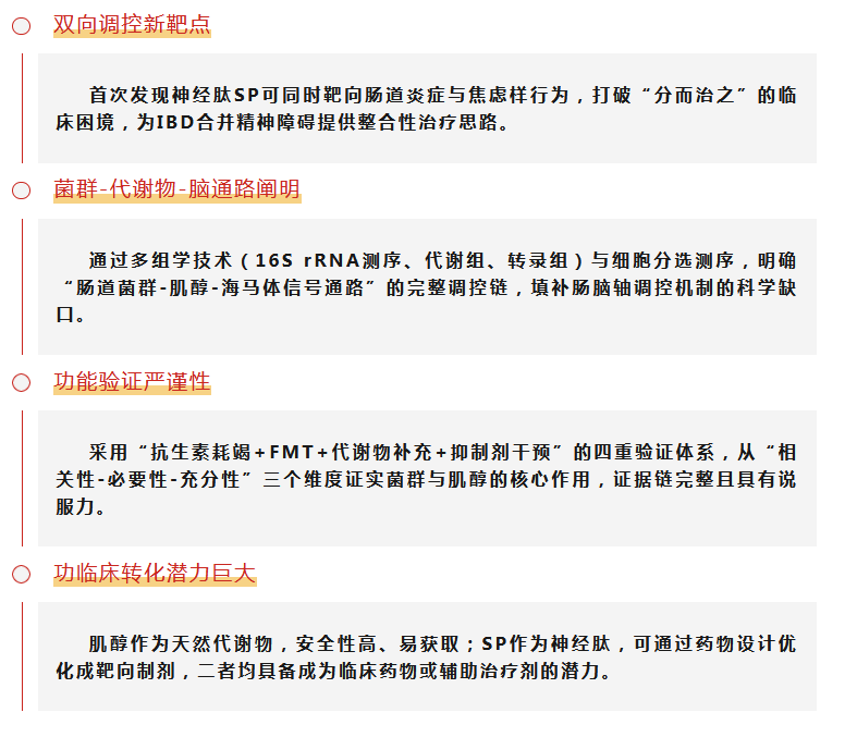 明确肌醇在SP调控通路中的“不可替代”地位,同时证实肌醇可直接调控神经细胞功能,完善“菌群代谢物 – 脑”的调控链条。