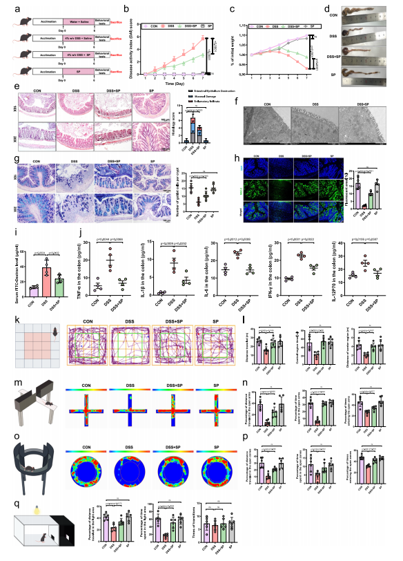 实验设计:采用4%DSS饮水诱导小鼠溃疡性结肠炎模型,通过静脉注射SP干预,从“肠道病理-肠道屏障-炎症因子-行为学” 多维度验证SP的保护作用。