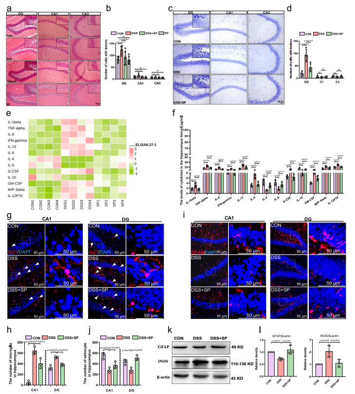 实验设计:IBD相关神经炎症会导致海马体神经元损伤、神经递质失衡。通过组织学染色、细胞标记与细胞因子检测,探究SP对海马体的保护作用。