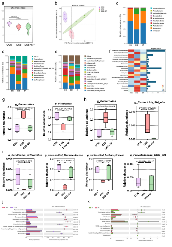 实验设计:探究SP是否通过肠道菌群发挥作用,通过16SrRNA测序分析SP对DSS诱导菌群失调的调控作用,结合PICRUSt2预测菌群代谢功能。