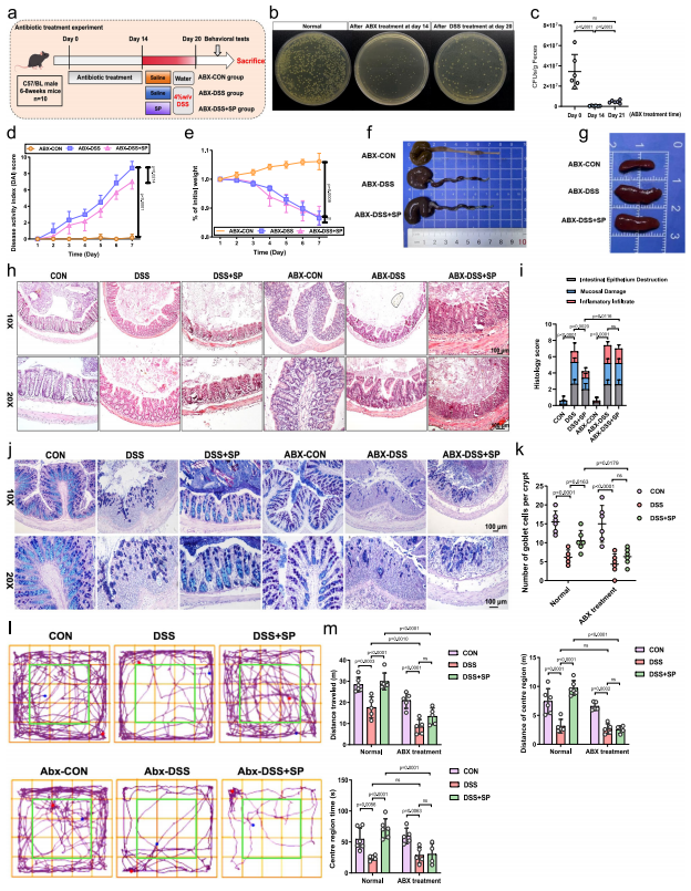 • SP保护作用失效:菌群耗竭后,SP对DSS诱导的结肠炎及焦虑样行为的改善作用完全消失,肠道屏障通透性与炎症因子水平未得到有效调控。