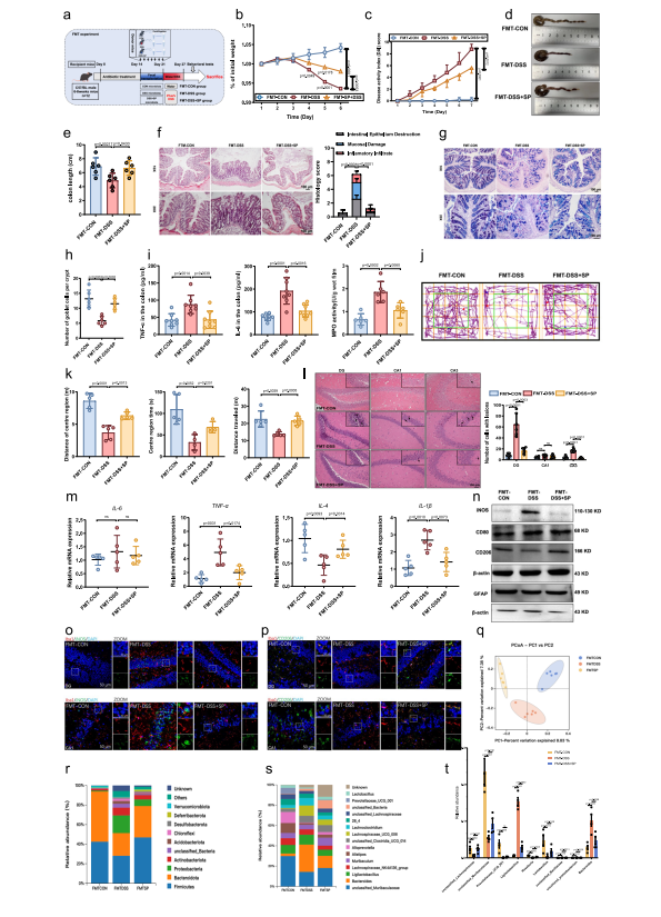 • 肠道保护传递:FMT-DSS+SP组结肠炎症状显著缓解,体重恢复、结肠长度增加,肠黏膜损伤与促炎因子水平降低,黏液屏障功能恢复。