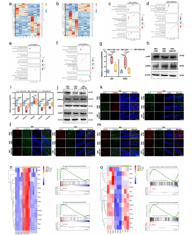 • 抑制NF-κB通路:FMT-DSS+SP组显著抑制海马体NF-κB激活,减少小胶质细胞促炎反应。