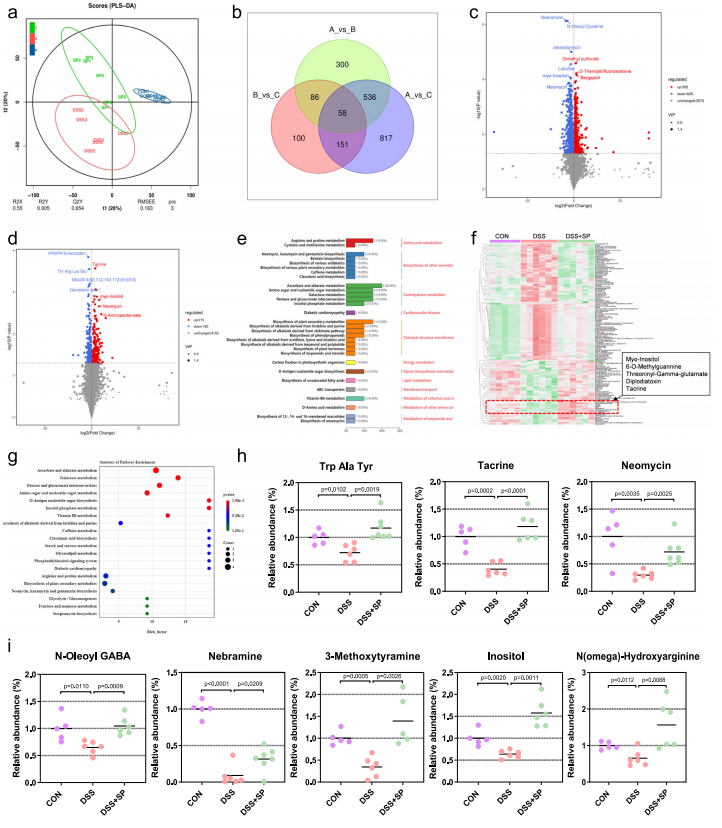 • 代谢谱分离:PLS-DA分析显示,三组代谢谱存在显著分离,DSS+SP组代谢表型更接近CON 组,表明SP可逆转 DSS 诱导的代谢紊乱。