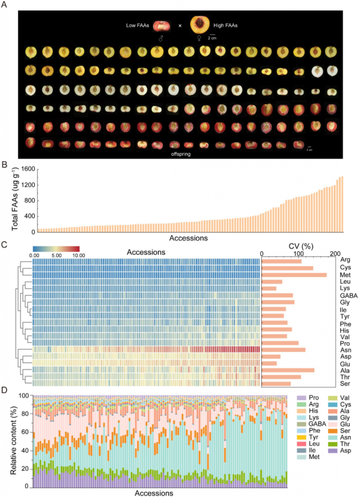 游离氨基酸是连接植物代谢生理与人类营养的关键枢纽,既是果实品质的生化决定因子,也参与逆境适应。在植物中,游离氨基酸通过能量平衡、生态适应和防御等通路调控生长、抗逆及次生代谢。对人类而言,9种必需氨基酸主要来自果实,部分氨基酸还可结合味觉受体,形成鲜、甜、苦味,并作为香气前体。近年研究发现其还参与抗病及采后品质维持,但果树中调控游离氨基酸积累、协调风味与抗逆的遗传机制仍不明确。