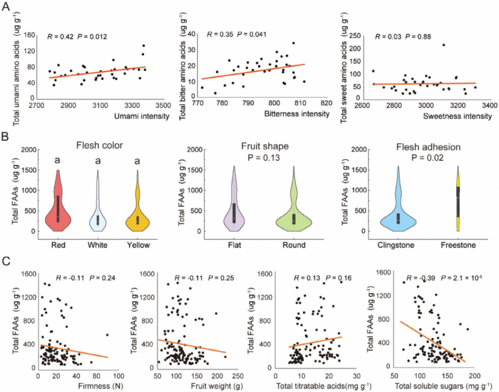 FAAs与果实风味密切相关。电子舌结果显示,鲜味氨基酸总量与鲜味强度显著正相关,苦味氨基酸总量与苦味强度显著正相关其中天冬氨酸(Asp)、谷氨酸(Glu)与鲜味显著正相关,苯丙氨酸(Phe)、缬氨酸(Val)与苦味正相关;甜味氨基酸与果实甜度无显著相关,说明甜度主要由可溶性糖主导农艺性状上,果肉颜色、果实形状、果实硬度、单果重及总可滴定酸与总FAAs含量均无显著影响,但红肉桃谷氨酸含量与鲜味显著高于非红肉桃,离核桃总FAAs含量显著高于粘核桃。可溶性糖总含量与总FAAs呈显著负相关。整体表明,FAAs主要调控鲜味与苦味,甜度由可溶性糖决定,且果肉色泽、果核黏离性会影响特定或总游离氨基酸积累。