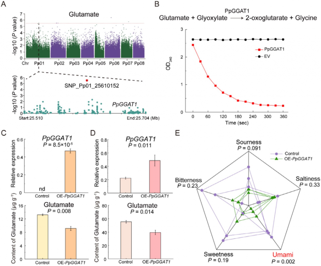 作者对19 种游离氨基酸(FAAs)开展关联分析,在桃 1 号染色体上定位到一个与谷氨酸含量显著关联的位点(SNP_Pp01_25610152),不同单倍型材料谷氨酸含量差异极显著。经基因组注释,确定该位点内的PpGGAT1为候选基因,与拟南芥AtGGT2高度同源。同时在2、6、7 号染色体上也检测到其他关联位点,但暂未明确对应候选基因,后续重点围绕PpGGAT1展开功能验证。体外与体内实验表明,PpGGAT1以谷氨酸和乙醛酸为底物,催化生成 2-氧戊二酸和甘氨酸。在本氏烟与桃果实中瞬时过表达该基因,均会使谷氨酸含量显著下降。电子舌检测显示,过表达PpGGAT1的桃果实鲜味强度显著降低,而酸味、甜味、苦味等其他味觉指标无明显变化。该结果证实,PpGGAT1通过调控谷氨酸含量影响桃果实鲜味形成
