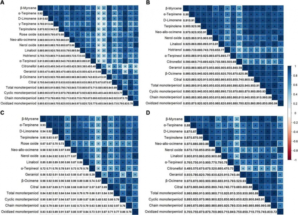图1 F1代群体中单萜类化合物性状的相关矩阵