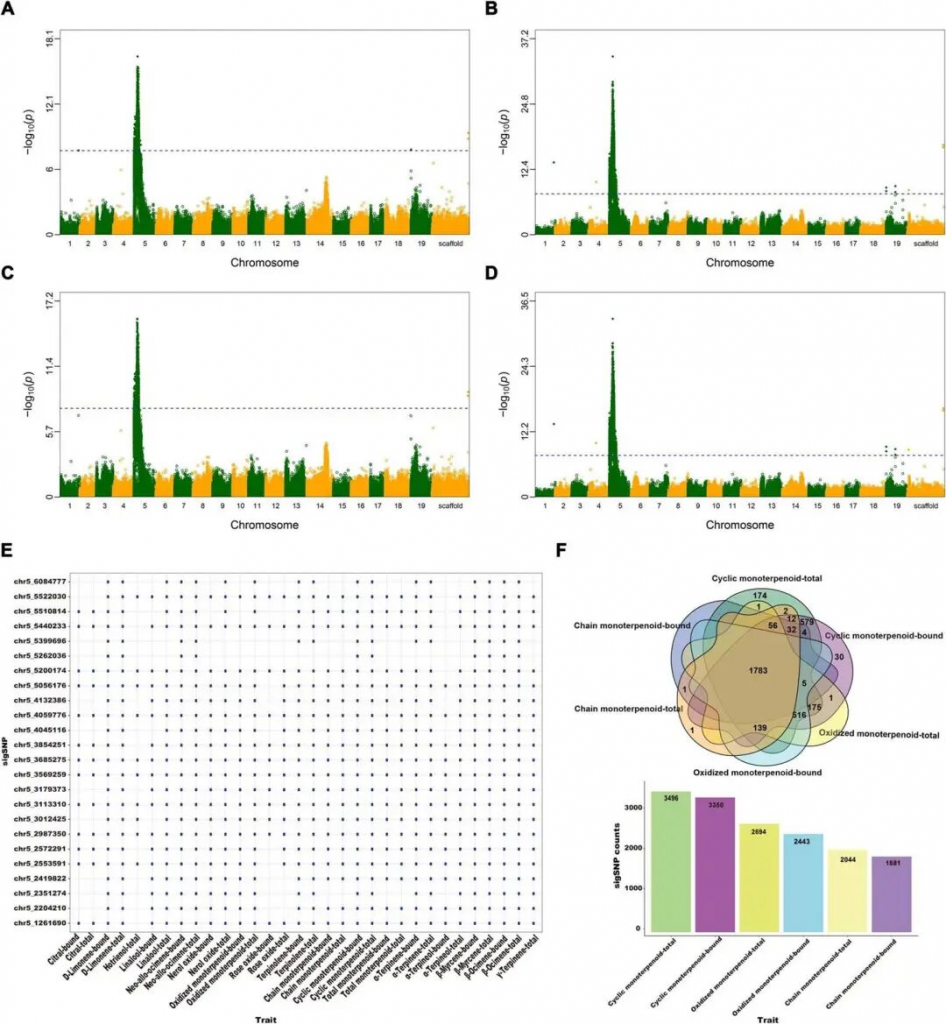 本研究以玫瑰香型品种“亚历山大麝香”与非芳香品种“圣诞玫瑰”杂交获得的F₁群体为材料,连续两年对单萜类物质含量开展全基因组关联分析(mGWAS)。研究共鉴定出4089个与单萜含量相关的显著SNP位点,以及892个候选基因。结果显示,无论是单萜类物质的糖苷结合态含量,还是总含量(糖苷结合态与游离态总和),不同单萜组分的关联信号均高度重叠,且绝大多数显著SNP位点富集于5号染色体约8 Mb的连续区间内,提示该区域存在调控单萜含量的分子标记簇。