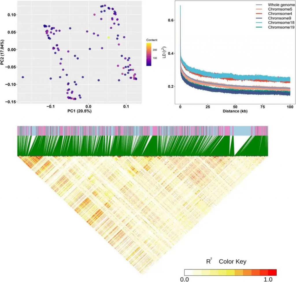 为验证5号染色体8Mb区间SNP簇的可靠性,主成分分析显示F₁群体单株随机分布,未按单萜含量聚类,排除群体分层影响;LD分析表明,5号染色体LD衰减速度与全基因组一致,排除背景LD干扰,且其重组特征符合全基因组规律,8Mb区间存在多个独立LD区块,提示多个遗传变异位点共同调控性状。随机选取50个显著SNP位点进行基因型-表型相关性分析,均呈显著相关,证实GWAS结果可靠。