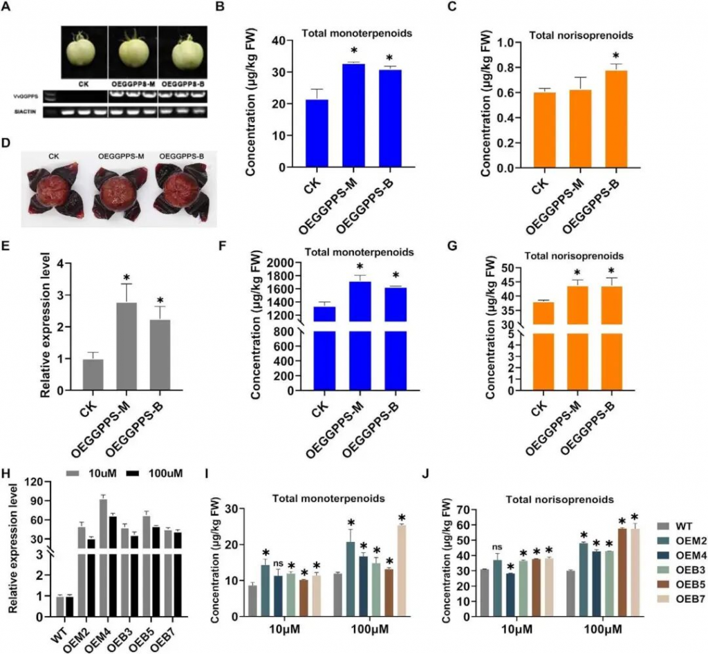 4. 基因过表达实验:克隆“白麝香455”和“小芒森”的VvGGPPS-LSU基因,构建重组表达载体,分别在番茄果实、葡萄果皮中进行瞬时过表达,在葡萄愈伤组织中进行稳定过表达,检测基因表达量及单萜类、类异戊二烯物质含量变化。