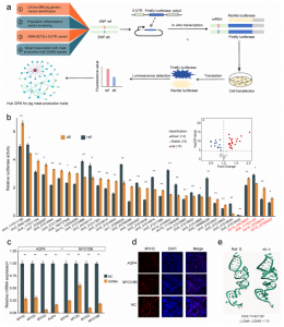 通过整合转录与翻译谱、群体遗传学分析及双荧光素酶报告实验,文章建立了一套全新的研究框架,用于挖掘复杂性状背后的基因调控网络(GRN)。利用该框架,文章鉴定出33个与生猪生产性状相关的功能性5’UTR变异,这些变异通过改变翻译效率调控14个靶基因。RNA干扰实验证实,AQP4和MYO18B参与肌细胞分化过程。