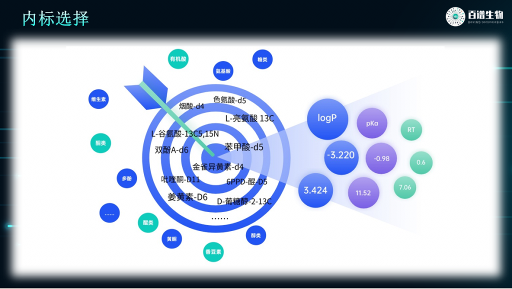 在植物广靶技术上加入同位素内标进行定量分析平台,拥有多种内标选择,能根据不同的检测需求和化合物特性,灵活挑选合适的内标,通过基质内标线性和自研算法校正,可以得到更为准确的定量结果。