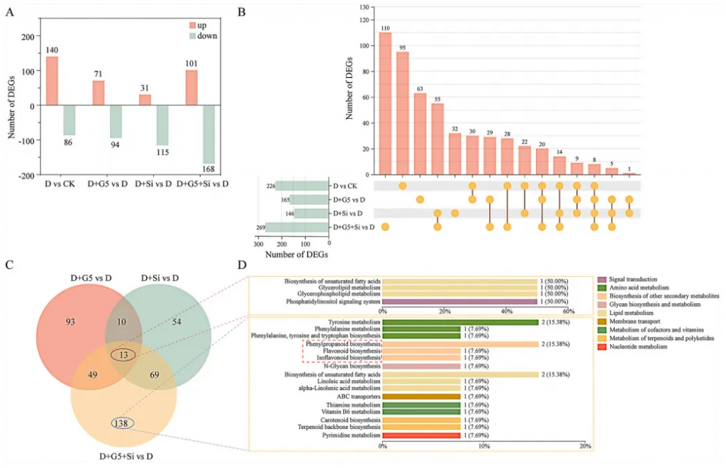 图4 在D与CK、D+G5、D+Si以及D+G5+Si的对比分析中,差异表达基因(DEGs)和差异表达代谢物(DEMs)被用于整合转录组与代谢组分析
