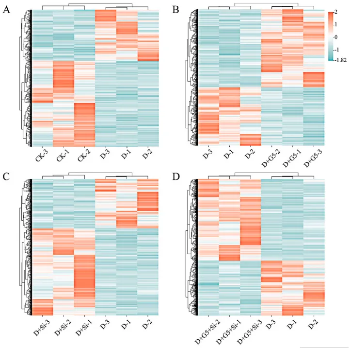 - 聚类热图呈现出不同处理组基因和代谢物的层级聚类特征;清晰反映对照、干旱胁迫及各缓解处理对甘草转录组和代谢组的差异化调控模式。