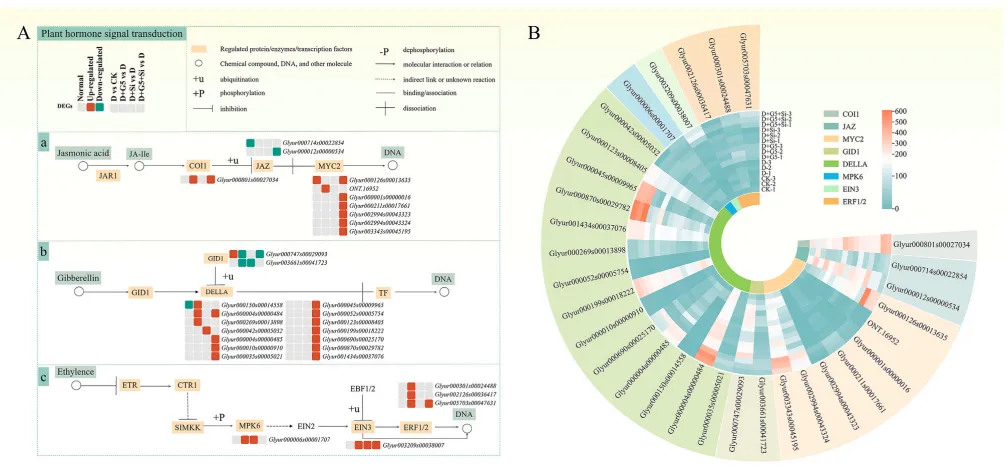 图6 G5或/和硅肥施用对干旱胁迫下甘草幼苗植物激素信号转导(含茉莉酸、生长素和乙烯)的KEGG流程图及差异表达基因表达热图