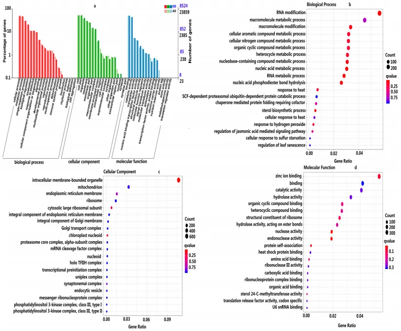 - 8524个差异表达基因(DEGs)注释到GO数据库,涵盖生物过程、细胞组分、分子功能三大类;核心富集条目包括RNA修饰、细胞芳香族化合物代谢、锌离子结合等,多呈下调趋势。