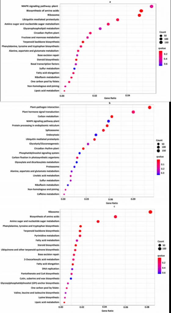 - 所有DEGs富集于132条KEGG通路,核心通路为MAPK信号通路、氨基酸生物合成等;上调DEGs聚焦植物-病原体互作、碳代谢,下调DEGs集中在氨基酸糖代谢、苯丙烷生物合成等。