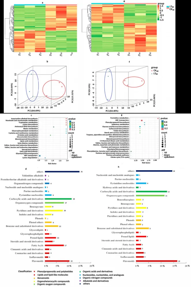 - 正/负离子模式下,DAMs聚类热图和PCA显示冷胁迫组与对照组分离明显;DAMs主要富集于氨基酸代谢、黄酮生物合成等通路,分类以苯丙烷类、脂质类、有机氧化合物为主。