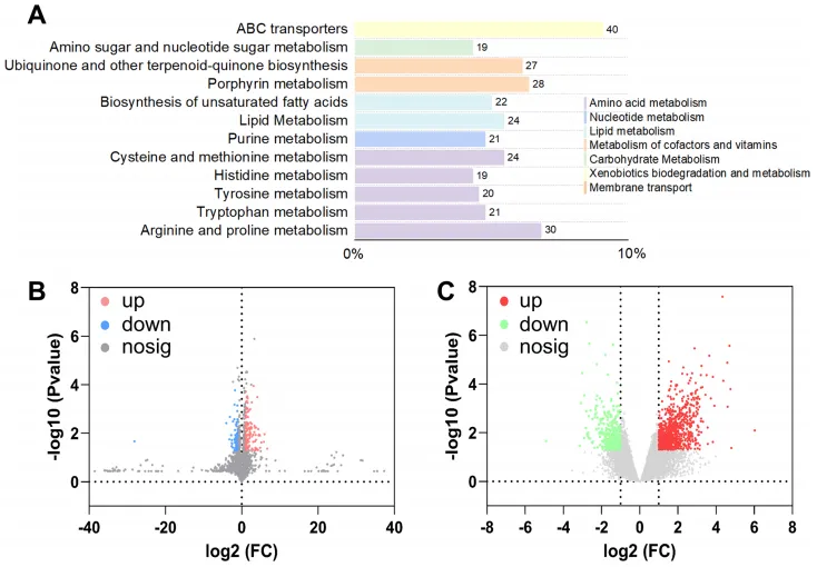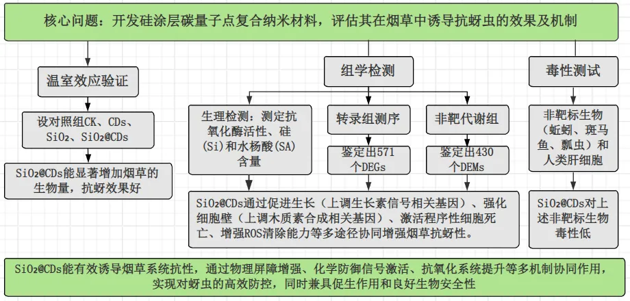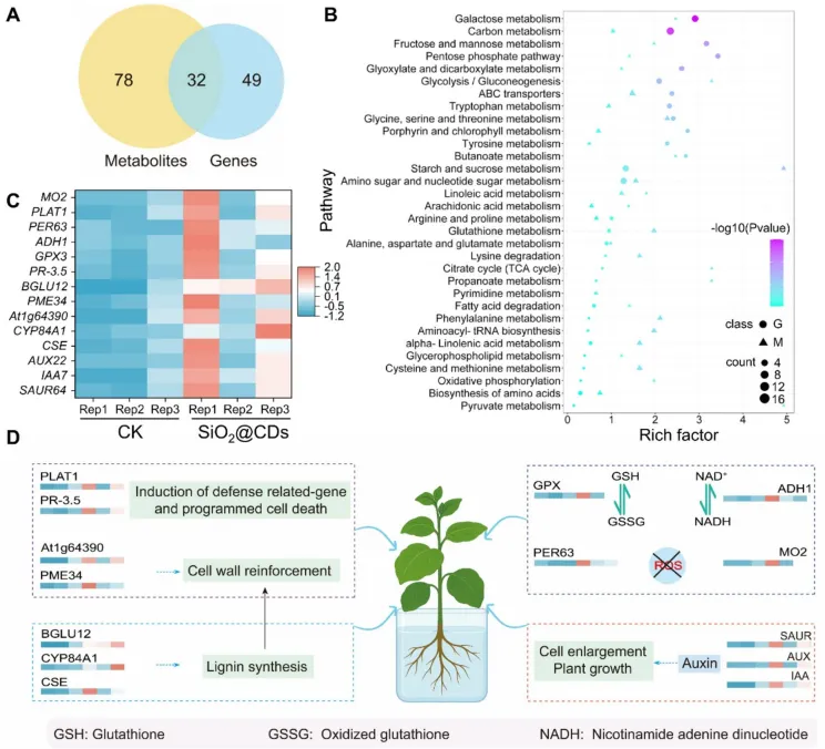 - 转录组和代谢组共富集32条通路,涉及碳代谢、氨基酸合成等关键过程。SiO₂@CDs通过上调生长素信号基因、细胞壁强化基因、木质素合成基因及抗氧化相关基因,从分子层面促进烟草生长并增强抗蚜能力。
