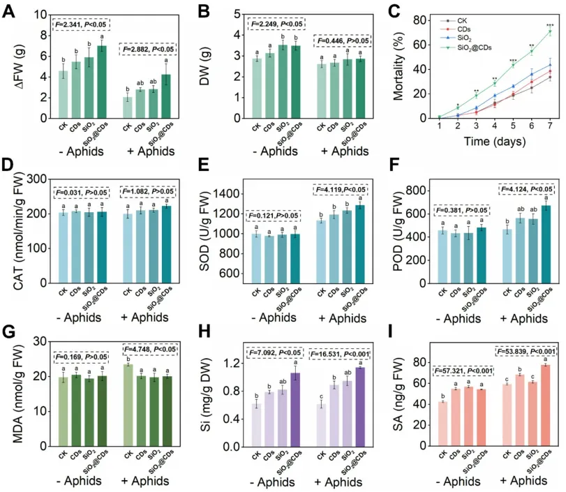 - SiO₂@CDs处理显著促进烟草生长(鲜重、干重增加),且在蚜虫侵染下仍保持生长优势;7天内蚜虫死亡率达71%,防控效果最优。蚜虫胁迫下,SiO₂@CDs显著提高烟草SOD、POD活性,降低MDA积累,同时促进Si和水杨酸(SA)积累,增强抗虫相关生理响应。