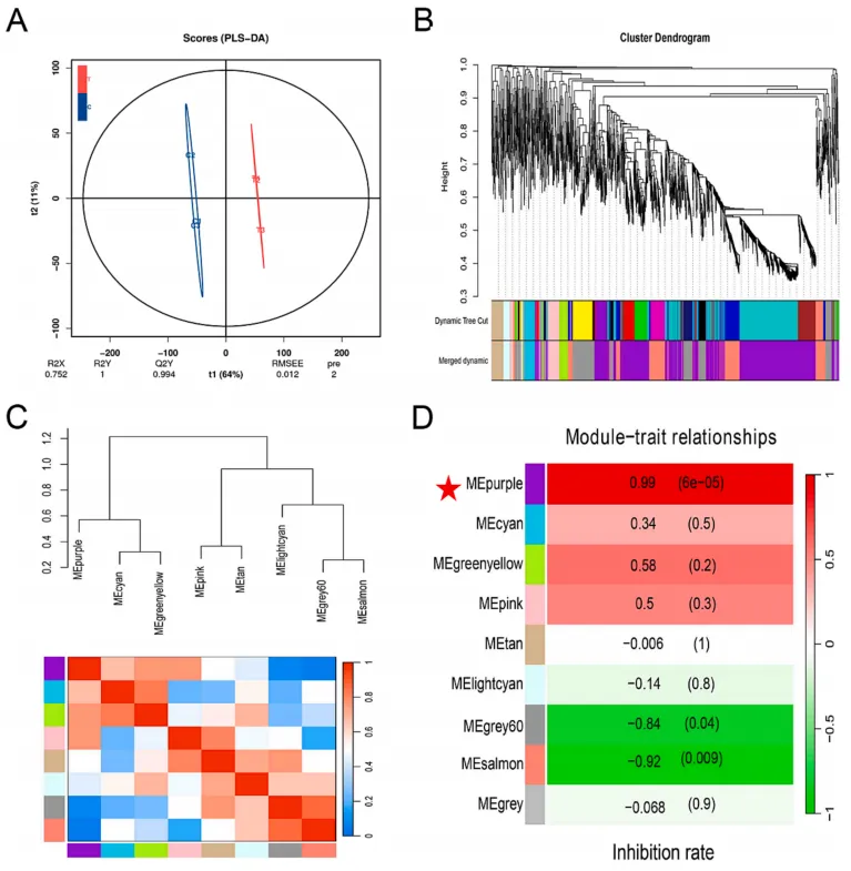 - 非靶代谢组的OPLS-DA模型显示,VOCs处理组与对照组草莓果实的代谢谱差异显著,模型稳定性和可重复性良好。WGCNA分析将2633个代谢物分为9个模块,其中紫色模块与抑菌率相关性最高(r=0.99),为核心功能模块。