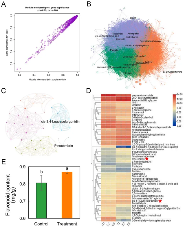 - 紫色模块含1128个代谢物,其中17个参与黄酮类生物合成通路,松属素(Pinocembrin)和顺式-3,4-白矢车菊素为核心枢纽代谢物。VOCs处理后草莓果实黄酮含量显著升高(从0.81mg/g增至0.87mg/g),证实黄酮类代谢参与VOCs介导的抗真菌过程。