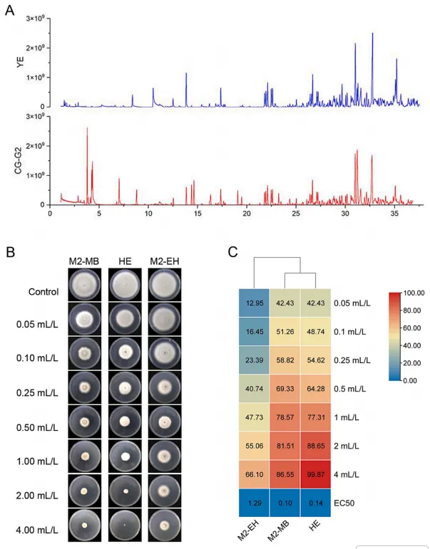 - 通过SPME-GC-MS鉴定出VOCs中3种主要活性成分:甲基2-甲基丁酸酯、己腈和甲基2-乙基己酸酯。体外抑菌实验显示,甲基2-甲基丁酸酯活性最强,三者均呈剂量依赖性抑制胶孢炭疽菌生长。