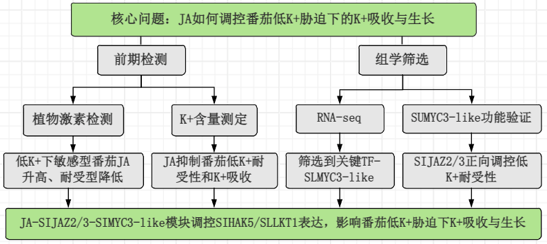 - SlMYC3-like在低K⁺敏感型番茄中高表达,MeJA可诱导其表达;SlMYC3-like直接结合SlHAK5和SlLKT1的启动子,抑制这两个K⁺吸收相关基因的转录。