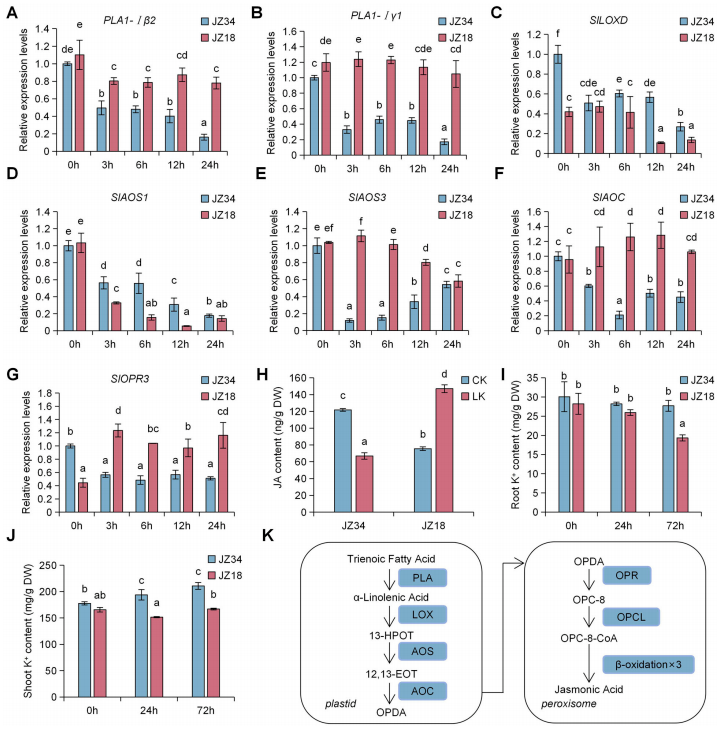 - 低K⁺胁迫下,耐低K⁺番茄JZ34的JA合成基因表达和JA含量低于敏感型JZ18;JZ34根和地上部K⁺含量更稳定,JZ18根K⁺含量持续下降。