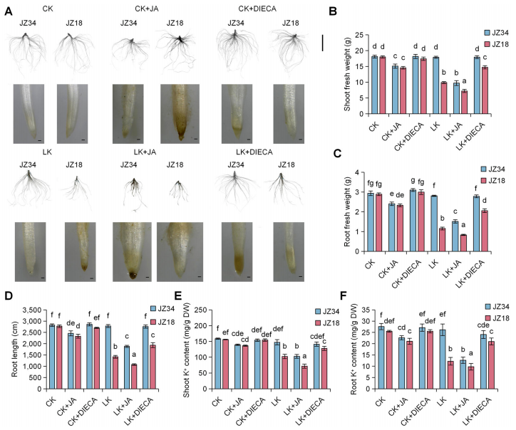 - MeJA处理抑制两种番茄的生长和K⁺吸收,低K⁺条件下抑制更显著;JA合成抑制剂DIECA可缓解JZ18的低K⁺胁迫抑制,恢复生长和K⁺吸收能力。