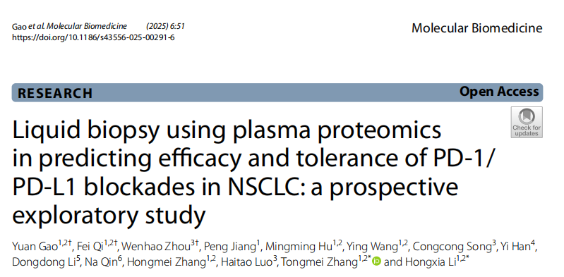 该研究采用Olink免疫肿瘤学panel(92种蛋白)对非小细胞肺癌患者血浆进行蛋白组学分析,发现PD-(L)1抑制剂治疗后42种蛋白显著上调(富集于细胞因子-受体相互作用、趋化因子信号通路),并筛选出应答相关(如TNF、CXCL10)及免疫相关不良反应(irAE)相关(如IL-4、IL-13)核心蛋白。通过LASSO-Cox回归构建的I-SCORE风险模型,基于8种关键蛋白实现对患者总生存期、无进展生存期及治疗应答的精准预测,且高评分与患者炎症及免疫抑制表型密切相关,证实了血浆蛋白组学作为液体活检工具在免疫治疗疗效与安全性预判中的可靠性,为临床筛选优势获益人群提供了实用工具。